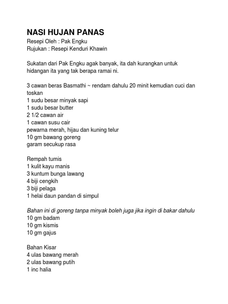 Resepi Nasi Hujan Panas Mat Gebu. Ayue gantikan kiub ayam dengan garam sebab suami tak boleh makan kiub ayam tu Resepi nasi 12 cwn susu cair 3 cawan beras Basmathi rendam dahulu 20 minit kemudian cuci dan toskan 1. 2 kuntum bunga lawang.